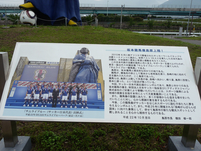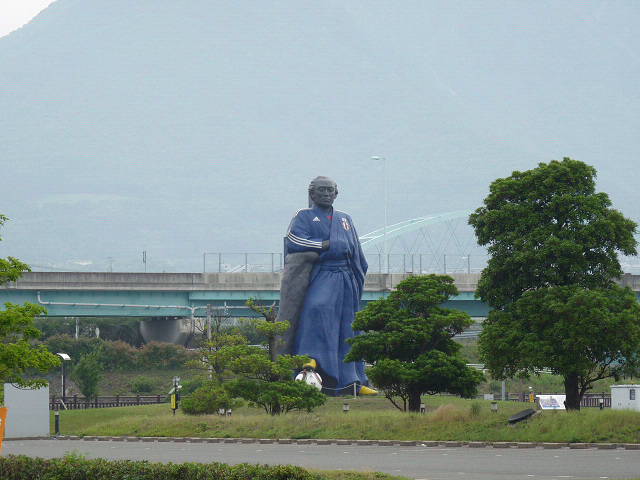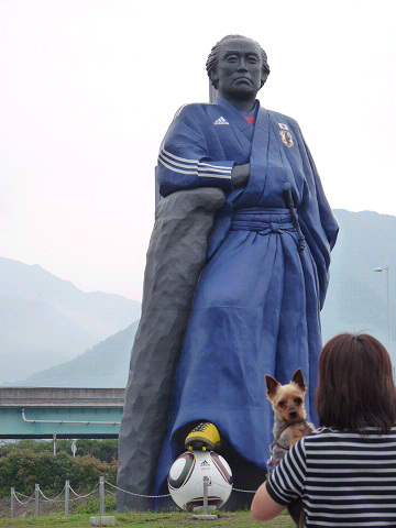 ここには巨大な坂本龍馬像がありました、数年前に来た時には無かったってパパが言っていました、それにしても龍馬さんの右腕の服がサムライブルーだよ、それに足元にはサッカーボールがあるよ、