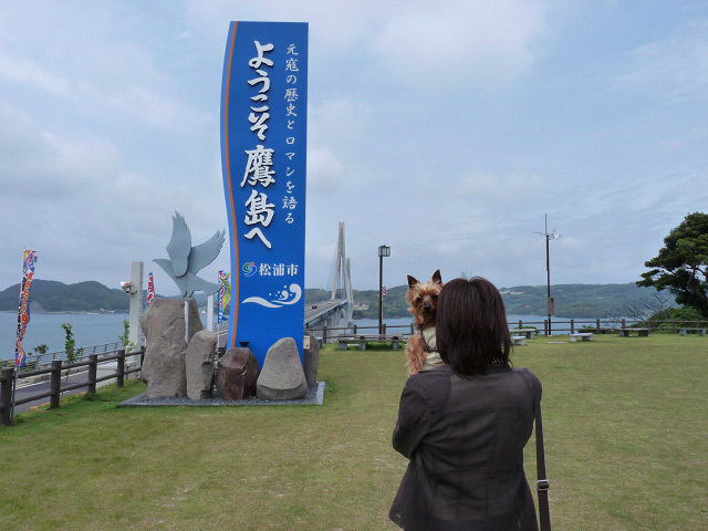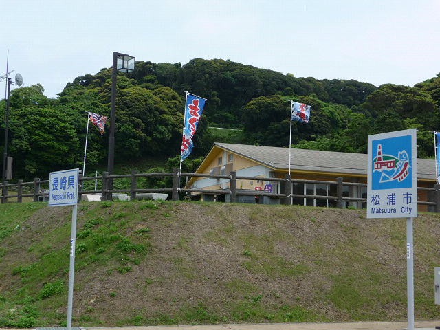 橋を渡りきったら、長崎県松浦市鷹島です、奥の建物が道の駅だよ。
