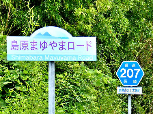 道路が登り坂に差し掛かると「島原まゆやまロード」の標識が見えてきて、そのすぐ横には県道207号と書かれた標識もありました。このすぐ手前には展望所らしき広い駐車場もあったので、島原まゆやまロードへ入る前にまずはここに車を停めました。
