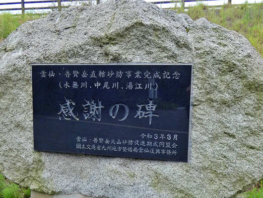 展望所?の駐車場には「感謝の碑」と刻まれた石碑があって、これには雲仙・普賢岳直轄砂防事業完成記念(水無川、中尾川、湯江川)とも刻まれていました。これらの川は普賢岳の大噴火による火砕流や、その後の雨による土石流の発生などで多くの犠牲者を出した川なんですよね。