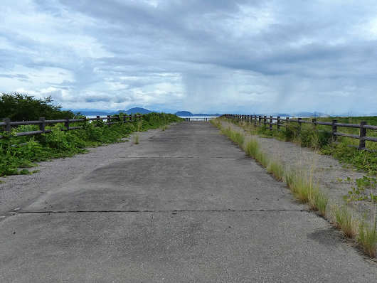 平成新山展望園地を過ぎてしばらくすると、島原まゆやまロードはピークを越えて下り坂になり正面に海が見えてきました。
