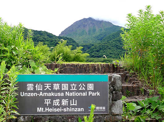 道路沿いの展望所を出発して先へ進むと、島原まゆやまロードはさらに標高を上げて「平成新山展望園地」と刻まれた小さな公園が見えてきたのでここに車を停めました。