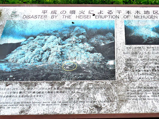 ここには広い駐車場もあって、駐車場の一角には火砕流の様子を写した写真パネルなどが展示されていました。千本木地区でも大規模な火砕流が発生して集落を飲み込んで一名の犠牲者が出たそうです。説明板が劣化していたので文字は読めませんでしたが、恐らく写真の丸印のところが千本木地区なんでしょうね。