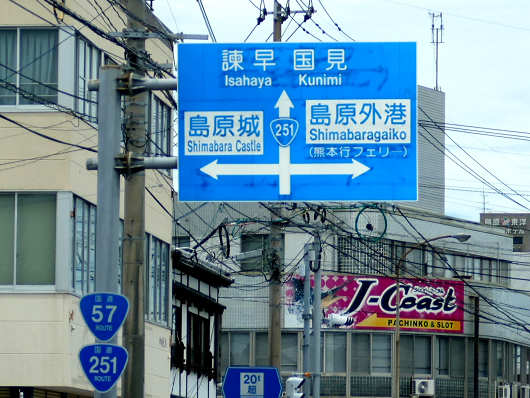 島原市街地へ入ると道路は国道57号と国道251号の重複区間となって、国道251号はこの先で海岸沿いを走る道となって諫早市へ続き、国道57号は島原市街地からは海上国道となって熊本県へと続いています。これから向かうのは標識に書かれている島原市のシンボルともいえる島原城です。