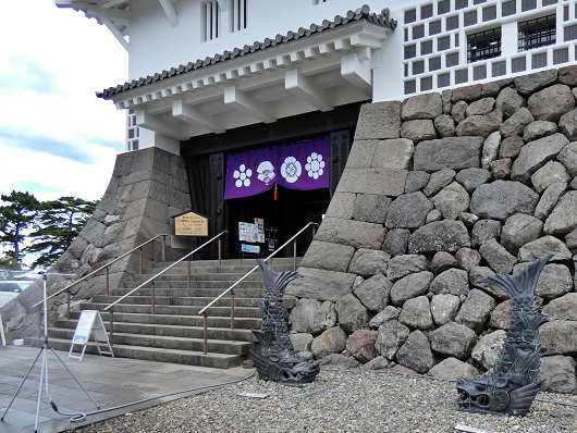 駐車場に車を停めたらここから城内へ入って、さっそく天守内部の展示物などを見物します。