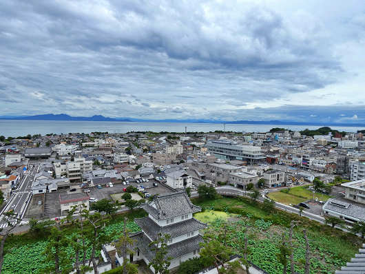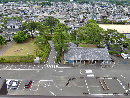 反対の西側を眺めると、足元には先ほど車で入ってきた進入路と、島原城本丸売店、駐車場が見えました。