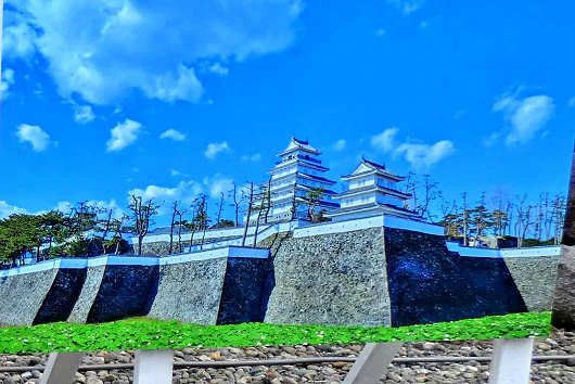 天守の見物が終わって城外へ出たら、お堀を含めた城跡を撮影するつもりでしたが、車を停められなくて、結局お城の周りを3回ほどグルグル回って、国指定史跡になっている城跡は眺めるだけに終わってしまいました。この画像は城内に立てられていた写真パネルです。