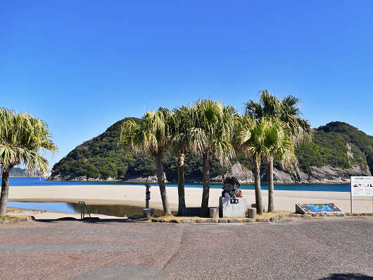 国道448号を右折して100mも進むと海岸へ出て、ヤシの木の向こうに幸島が見えてきました。