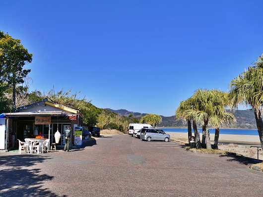 ここは観光施設といえるほどのところじゃないので、海岸沿いに十数台の普通車が停められる駐車場と「幸島 浜の店」という小さなカフェ?が1軒あるだけです。