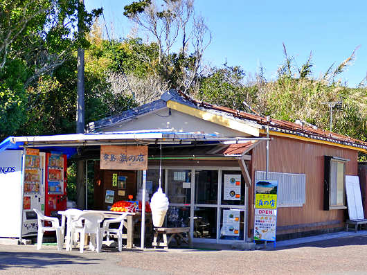 この建物が「幸島 浜の店」です。ここへは寄りませんでしたが、店頭にはミカンなどが並べられていて、店内ではコーヒーやチーズケーキなどの他にヤキソバ、ちゃんぽんなども食べられるようでした。