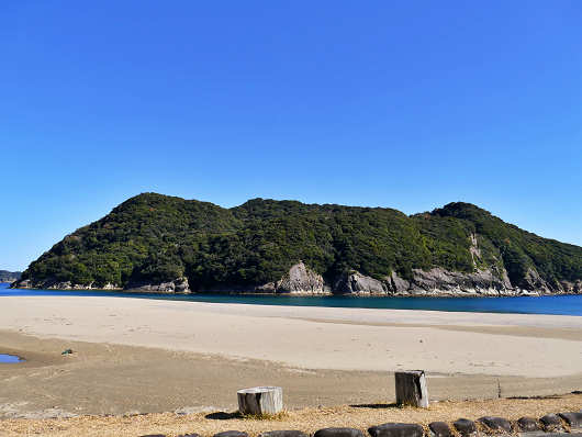 駐車場から眺めた幸島です。幸島は陸地からわずか100mほどのところにあって、砂の堆積によって対岸と陸続きになることもあるそうで、数年前には陸地と繋がった時にボス猿が島を出て、それ以降行方不明になったと新聞に載っていました。