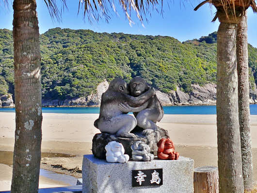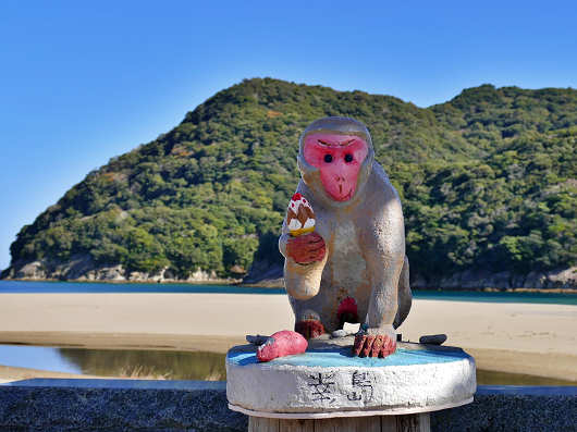 駐車場の横にはこの様な可愛らしいおサルの像もありました。幸島のサルは午前中には岩場に出てくるそうなので、ここからでも運が良ければ見ることができるそうですが、基本的にはすぐ近くの港から渡し船で島へ渡っての見物になるそうです。