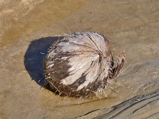 何だろうか?と近くまで行って眺めてみるとヤシの実でした。どこからここへ流れ着いたのかは分かりませんが、まるで島崎藤村の詩で、歌曲にもなった「椰子の実」の出だしの「名も知らぬ 遠き島より 流れ寄る 椰子の実ひとつ・・・」って感じでした。