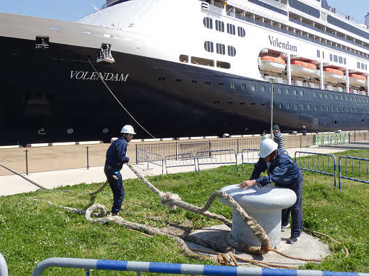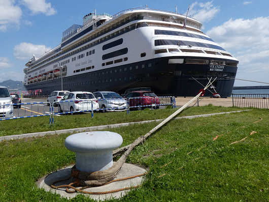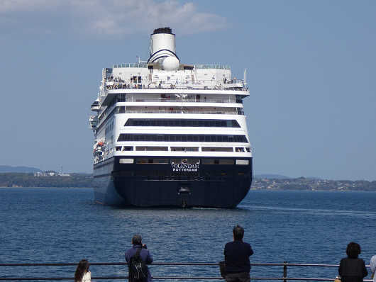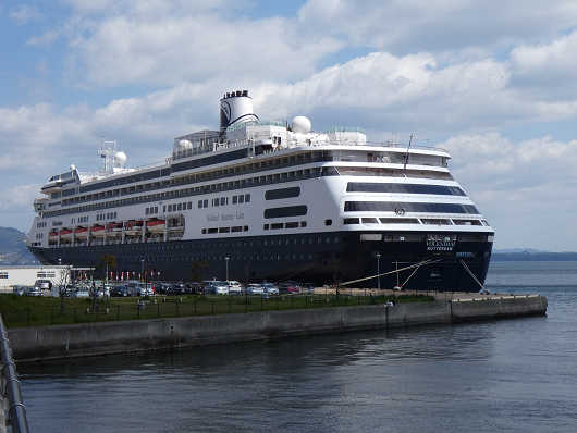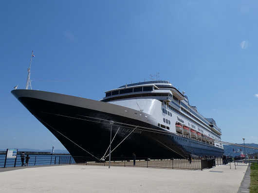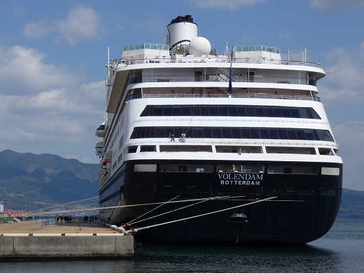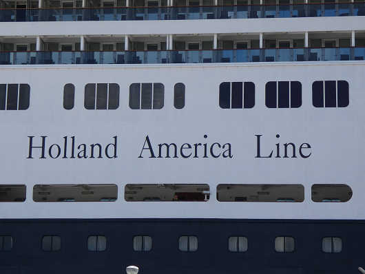 船体の真ん中辺りには ゛ホーランド アメリカ ライン ゛と横文字で書かれていました。この会社はアメリカに本拠地を置くクルーズ会社で、数万トンクラスのクルーズ船を何隻も保有している会社です。そして所有する全ての船に〇〇ダムという名前がつけられているそうです。