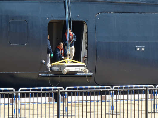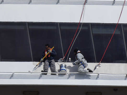 ここへ着いた時には乗船客はすでに船を降りて別府市内の観光などに出かけていましたが、船上では多くの人たちが色んな作業をしていました。この人たちは長い安全ロープを着けて塗装の補修を行っていました。