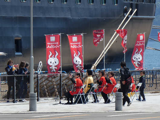クルーズ客船・フォーレンダムの出港予定時間を港湾関係の人に聞いたら、一旦お家へ戻って食事を済ませてから出港予定の一時間ほど前に再び別府国際観光港に来てみると、岸壁では三味線の演奏が行われていてスピーカーから大きな音で流れていました。