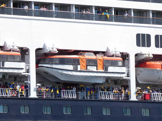 もやい綱が全て解かれて長い汽笛が響き渡りフォーレンダムが岸壁を離れると、音楽が流れて乗客が黄色い布を振り始めました。