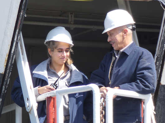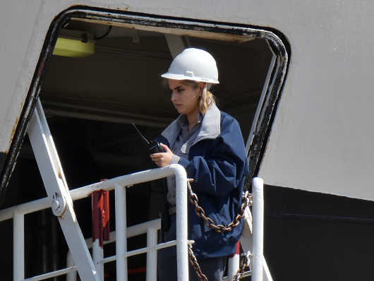 このもやい綱を外す作業は岸壁の作業員と船上の作業員が連絡を取りながら行っているようでしたが、船上から地上へ指示を出していたのはヘルメットを被って厳しい顔をした若い女性でした。