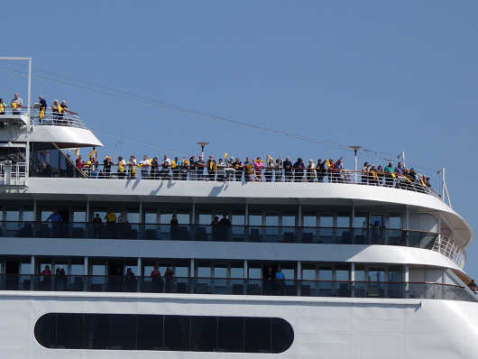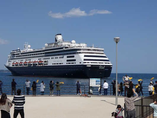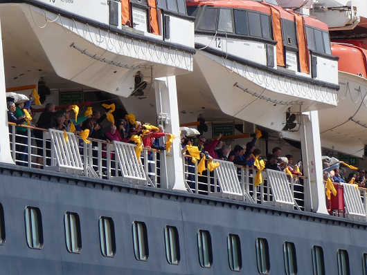 最上階のデッキにも大勢の乗船客が出て黄色い布を振っていましたが、昔のように紙テープを投げるなんてことはしないんですね(笑)