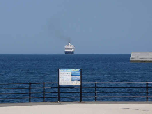 別府国際観光港へはこれまでにもクルーズ船の見物に何度か来ていますが、十万トンクラスの客船になると岸壁には収まりきらずに船体の一部が岸壁からはみ出します。でもこの客船はかろうじて岸壁の幅に収まっています。