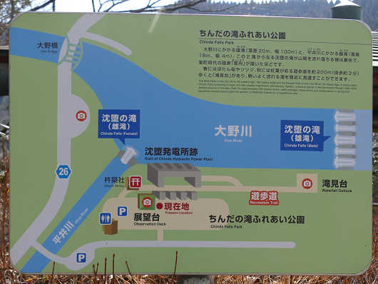 これは沈堕の滝の周辺案内図です。今は県道26号線沿いのカメラマークがある撮影スポットにいますが、これから現在地と書かれている 『ちんだの滝ふれあい公園』 に車で移動です。