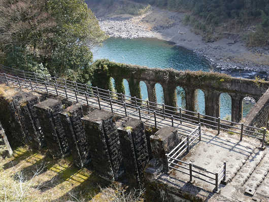ちんだの滝ふれあい公園に移動して大野川の川面のほうを眺めたら足元には明治時代に造られた発電所跡と遊歩道が見えます。