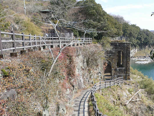 発電所跡の見物をしたら沈堕の滝に向かって伸びている遊歩道を先へと進みますが、遊歩道は途中から狭くなって両側にはうっそうとした樹木が茂った半日陰となります。夏だったらヘビが出てきそうですね(笑)