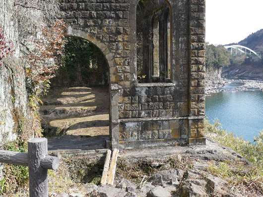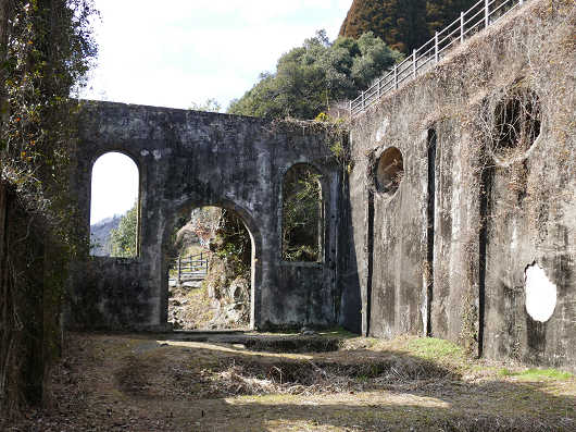 発電所跡は外壁のみが残っていますが、右側の壁には大きな丸い穴が全部で3つ開いていて、そのすぐ下の地面にはそれぞれ大きな窪みがあったので壁の穴には送水管が通っていてその下には発電機があったんでしょうね?