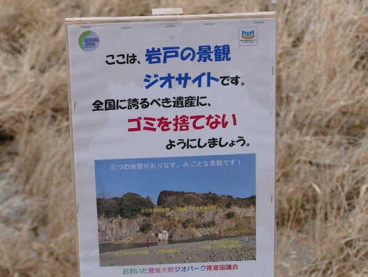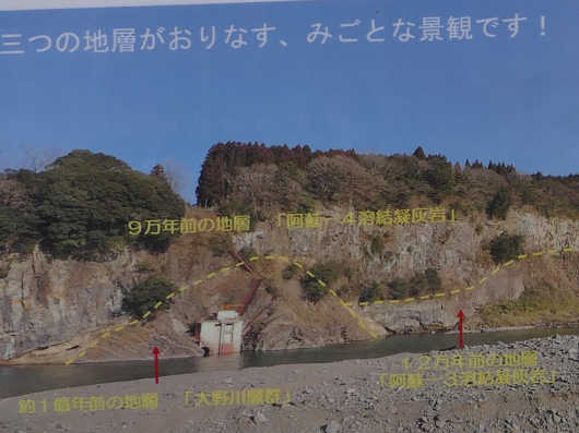 この看板の写真に書かれているようにここでは過去の阿蘇山の大噴火によって出来た一億年前の地層と12万年前の地層、9万年前の地層が折り重なっている見事な景色が見れるそうです。