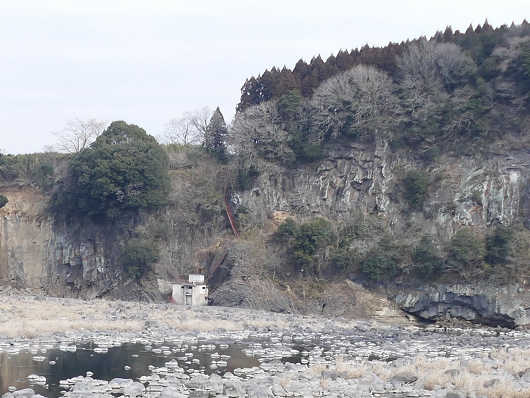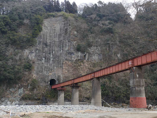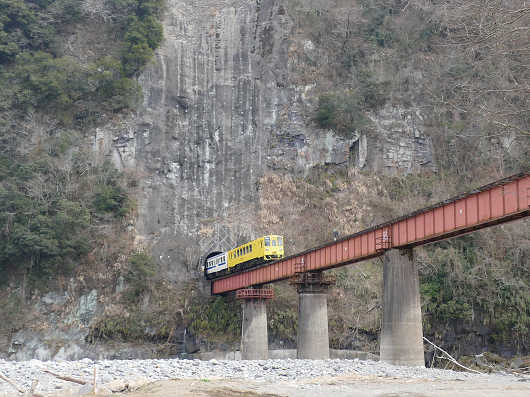 それよりも私が気に入っている景色は重なり合った地層のすぐ横にある大野川にかかるJR豊肥本線の鉄橋が断崖絶壁に掘られたトンネルの中へと続くこの光景です。トンネルの向こう側は大分市方面になります。これらは百枝鉄橋、百枝トンネルというそうです。