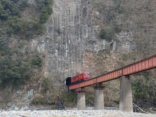 そして十数分後には熊本方面からやって来た2両編成の電車が吸い込まれるようにトンネルの中へと入って行きましたが、よく見るとトンネルの入り口と電車の間にはわずかな隙間しかありません。