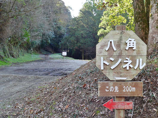 数分も歩くと八角トンネルに到着です。鉄道の遺構などはすべて撤去されて、今は自然豊かな山の中って感じのところですが、いきなりこの様な人工物が現れると何とも不思議な気がしますね。