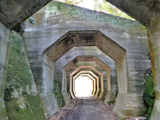八角トンネルはトンネルと名前が付いていますが、実際には八角形に穴の開いた壁のようなものが等間隔で並んでいるので、トンネル内には天井や側面から光が差し込んで思ったよりも明るいんですよね。
