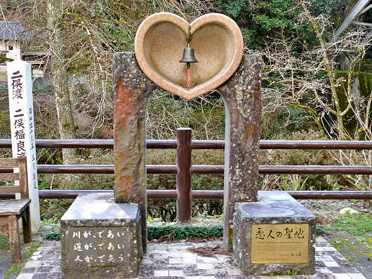 二俣渡を渡ったところから眺めた景色です。手前の石橋が「二俣渡」で、石橋の下には川へ降りる階段が見えていますが、この辺りには時季と時間限定で太陽光によってハートマークが出現するんですよね。