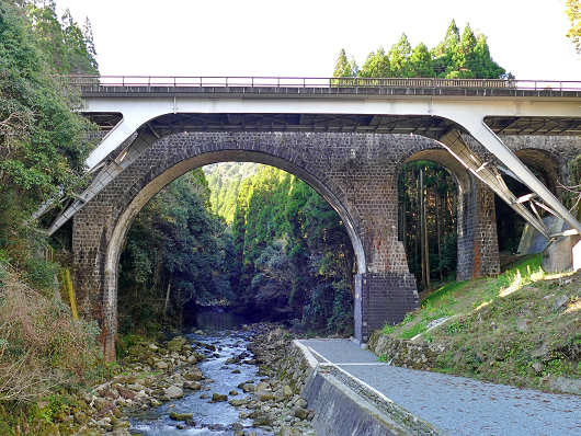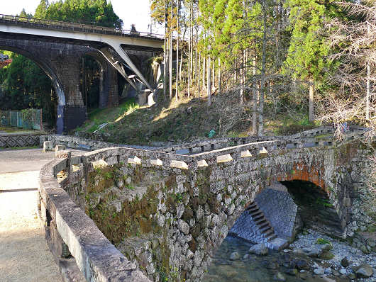 この川は釈迦院川です。画像には2つの橋が写っていますが、手前に見える鉄骨製の橋は国道218号の「新年称橋(しんとしねばし)」で、その奥に見える石橋は1920年に架橋された「年称橋(としねばし)」です。
