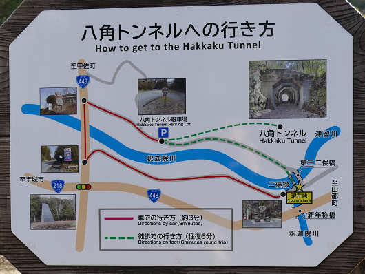 ここには八角トンネルへの行き方と書かれた説明板もありました。これを見ると徒歩で八角トンネルへ行くにはかなり大回りをしますが、直線距離ではこのすぐ近くにあるので、迂回せずに行ける階段(遊歩道?)を設ければ、便利になって訪れる人も増えそうな気がしますね。