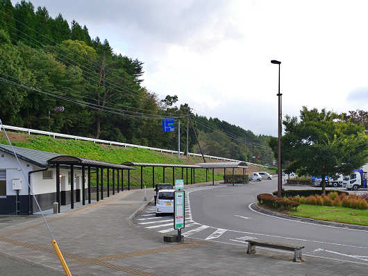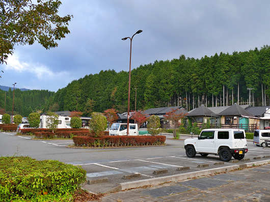 駐車場は第1、第2と分かれていて、普通車143台、大型車14台が停められます。物産館の前にある第1駐車場の中央部分は2~3台分のスペースごとに植栽によって分けられています。この画像は行きに撮影したので、この時はキャンピングカーが何台か停まっていて、普通車も窓に目隠しをして車中泊をしているようでした。植栽によって細かく分けられているので車中泊がし易いんでしょうね。