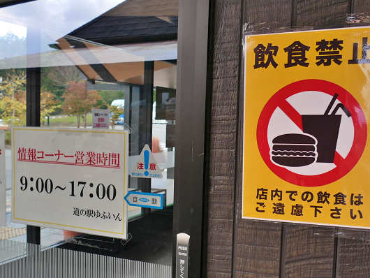 そして入口にはこの様な貼り紙がありました。休憩コーナーじゃないので飲食禁止は当然ですが、営業時間が日中だけなので、早朝や夜間に訪れても中へ入れなくて、観光パンフなどはもらえないんですよね。
