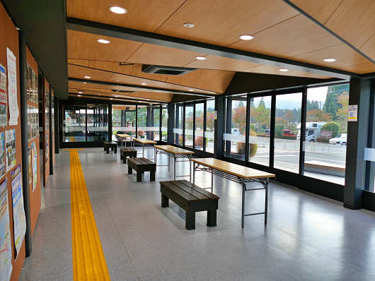 こちらは休憩コーナーです。こちらも情報コーナーと併せてリニューアルされ、大きな明るいガラス窓や、広々とした空間にイス、テーブルが置かれていました。ここにはトイレも併設されていて24時間利用可能です。奥のガラス扉からは情報コーナーを通って物産館などへ行けますが、この扉も9:00~17:00以外は閉まっているんですよね。