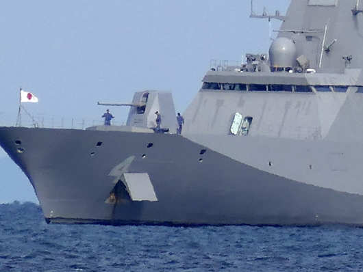 護衛艦「みくま」を正面から見た画像です。従来の護衛艦とは全く異なる船型で、レーダーの反射を低減するために全体が傾斜した平面になっていて、レーダー類も一本にまとめられた一角獣の大きな角のようになっている不思議な形をしています。