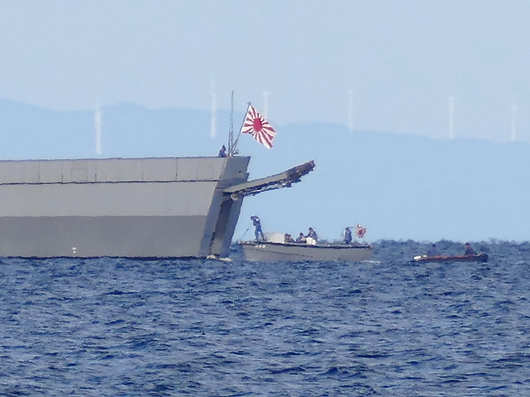 艦尾を見るとハッチが開いて、内火艇(艦載艇)が横付けするところでした。このような構造のハッチは輸送艦ではよく見られますが、従来の護衛艦には無かったもので、艦載艇などもレーダーの反射防止のためにすべて艦内へ収まるようになっているんですね。この日は強風が吹いていましたが、天気は良くて遠くには四国の風力発電の風車も見えました。