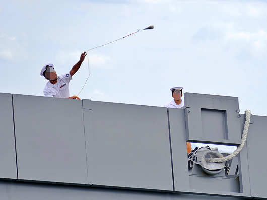 タグボートに押されて接岸すると、艦上からは係留ロープと繋がったヒービングラインが投げられました。画像には係留ロープも見えていますが、ここもロープを出していない時には扉が閉まっているようでした。