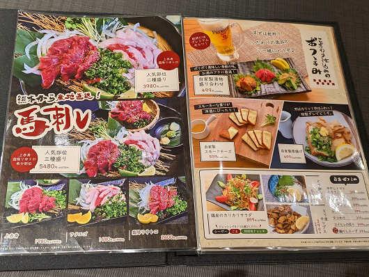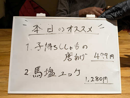 飲み物とお通しを運んできた店員さんが本日のおススメメニューも持ってきたので、まずはこの2品を注文しました。