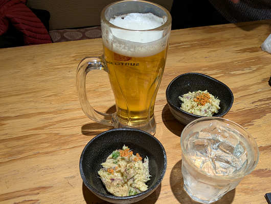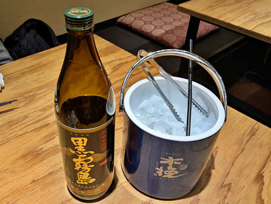 席に座ったらまずはアルコールの注文です。今回も私は芋焼酎の黒霧島ロックを、りゅうママは生ビールを注文しました。