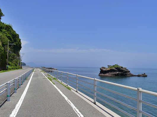 国東半島の海岸部は砂浜が多くて、県南地方のように荒々しい岩が点在するような光景はほとんど見られませんが、国道213号が内陸側から海が見える海岸線ギリギリを走るカーブに差し掛かったら、前方に不思議な形の小島のような岩が見えてきました。