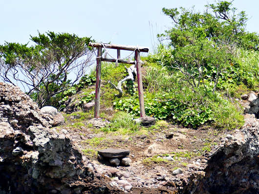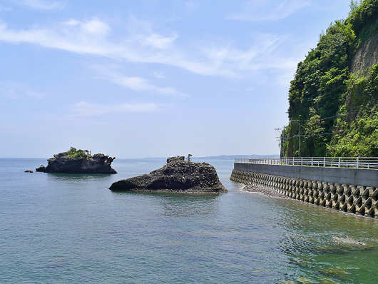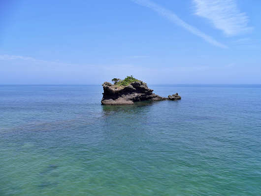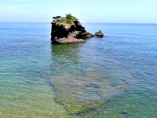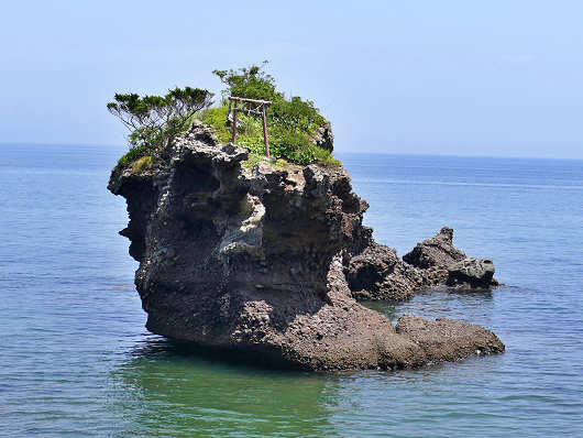 そして最初に見た岩よりもかなり大きくて、岩の上には樹木や草なども繁って地面のようになっていて、鳥居も建てられていたので、まさに小島って感じでした。鳥居の前にはテーブルような平らな岩もありましたが、これを祭壇に見立てて豊漁祈願などを行っているのかも知れませんね?この岩はグーグルマップで調べたら「金毘羅岩」というそうです。