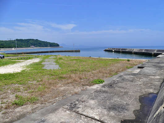 この岩があるところは国道がちょうどカーブしていて、道路脇にも車を停めるようなスペースが無かったので、50mほど通り過ぎた先にある漁港に車を停めました。ここは「奈良原漁港」と言うそうですが、このすぐ先は奈良原海水浴場という広い砂浜なんですよね。