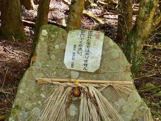 しめ縄が渡された岩の上には ゛浄化された水じゃないので飲まないでください ゛と書かれていました。この辺りは人家が全く無い山の中なので、飲んでも問題が無いとは思うんですが、こんなことを書かれていたら飲めませんよね(笑)
