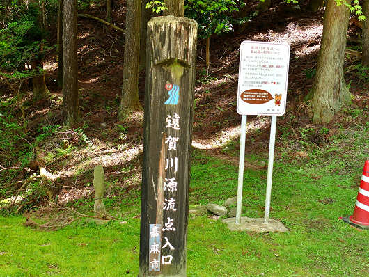 そして「遠賀川源流点入口」と書かれた木柱もあって、奥の杉林には登山道のような道もありました。遠賀川の源流はここじゃなくて、さらに山奥へ入ったところにあるようですね。