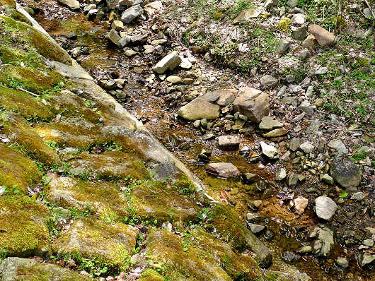 小岩のゴロゴロした斜面の下の方を見ると、伏流水が浸み出して沢のようになっていて、チョロチョロとわずかに水が流れていましたが・・・